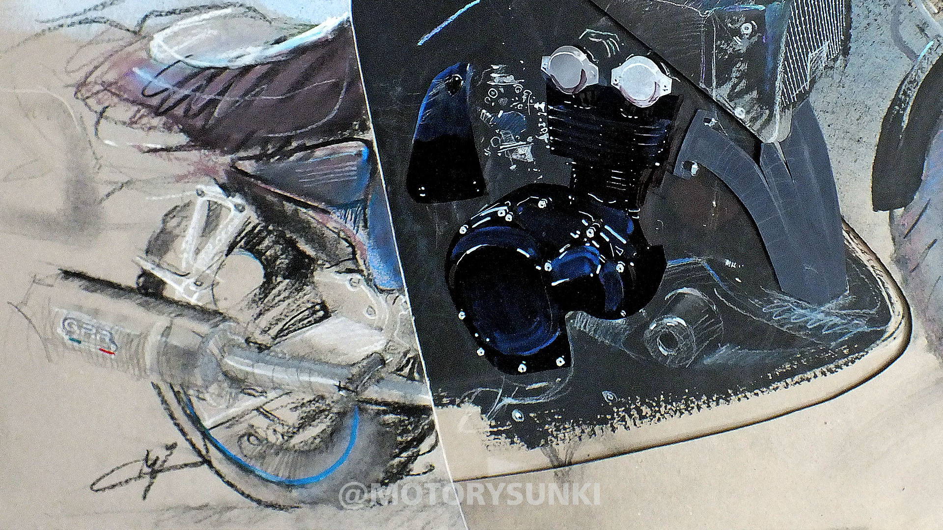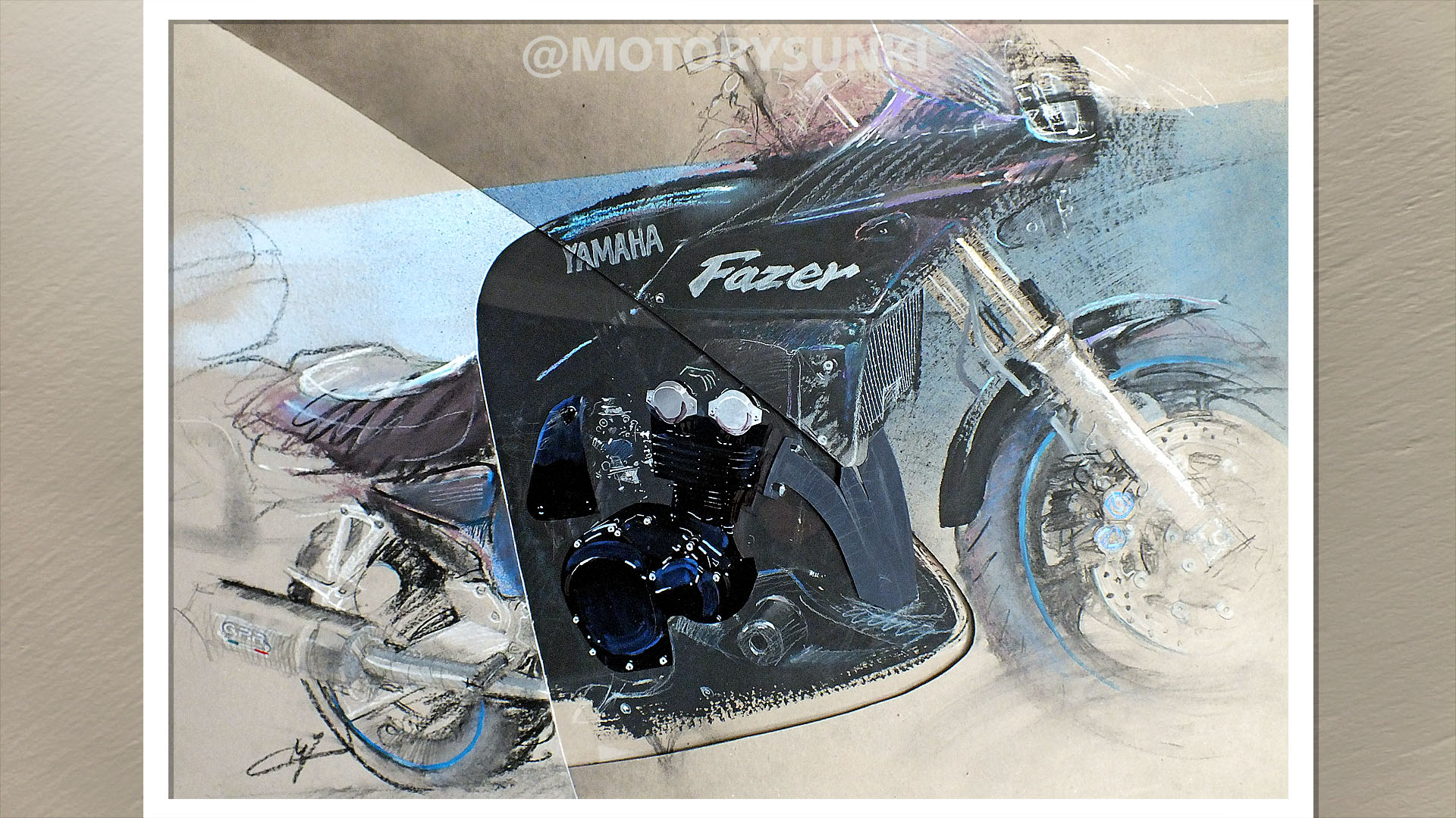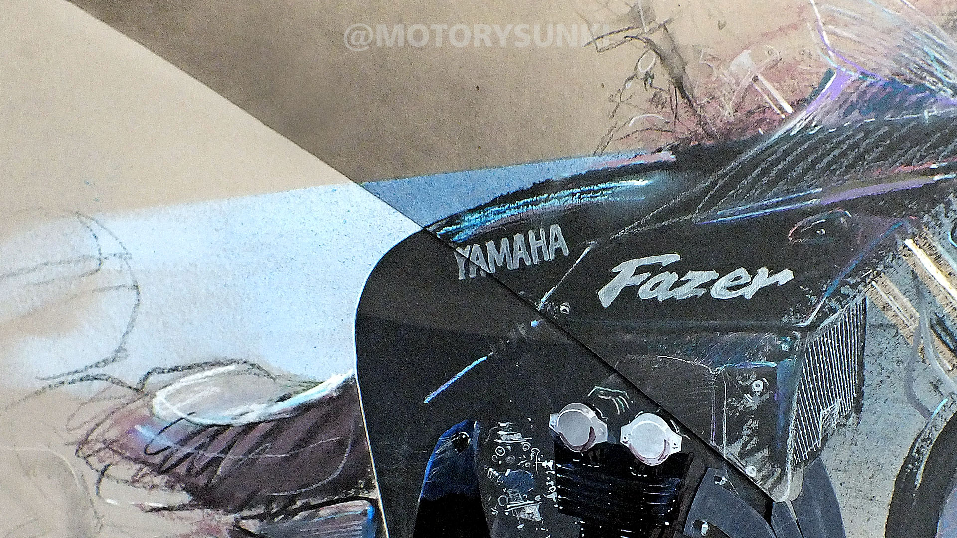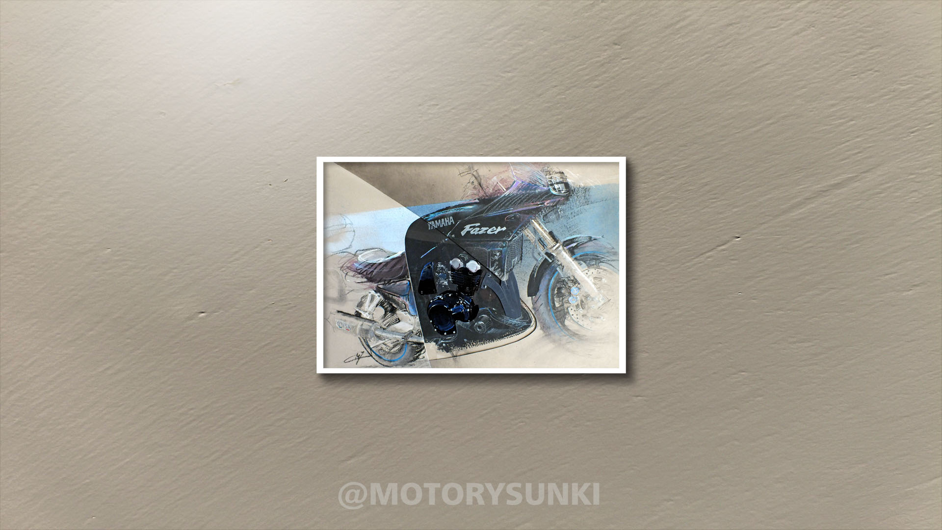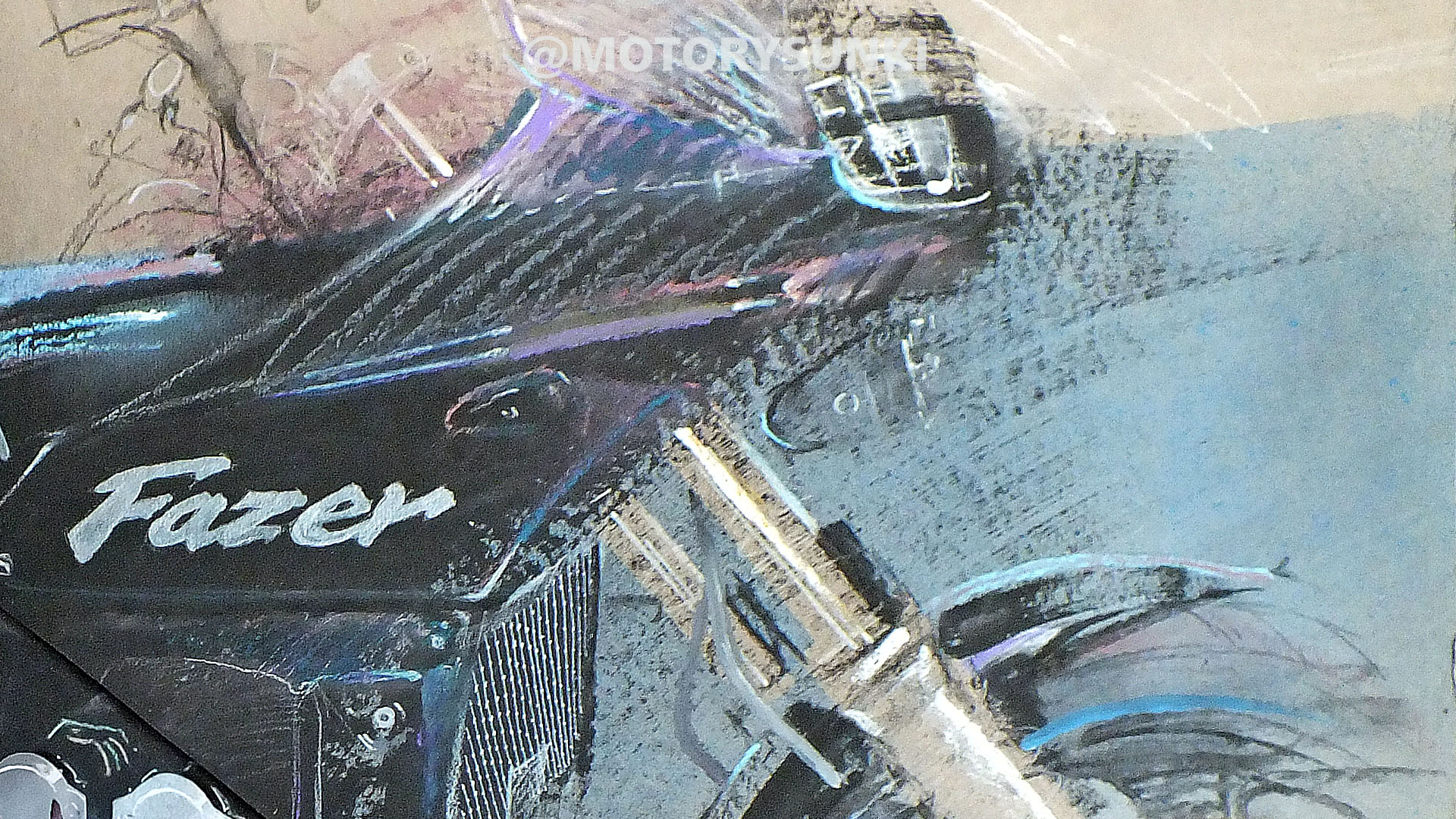 Dla uzyskania efektu błyszczącego czarnego silnika użyłem pleksi jako środka wyrazu artystycznego. Środkowa część obrazu błyszczy się, reszta jest matowa… Bardzo nietypowy portret Yamahy FZS 600 Fazer dla Krystiana.