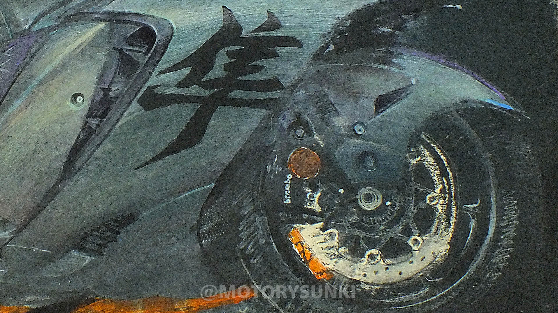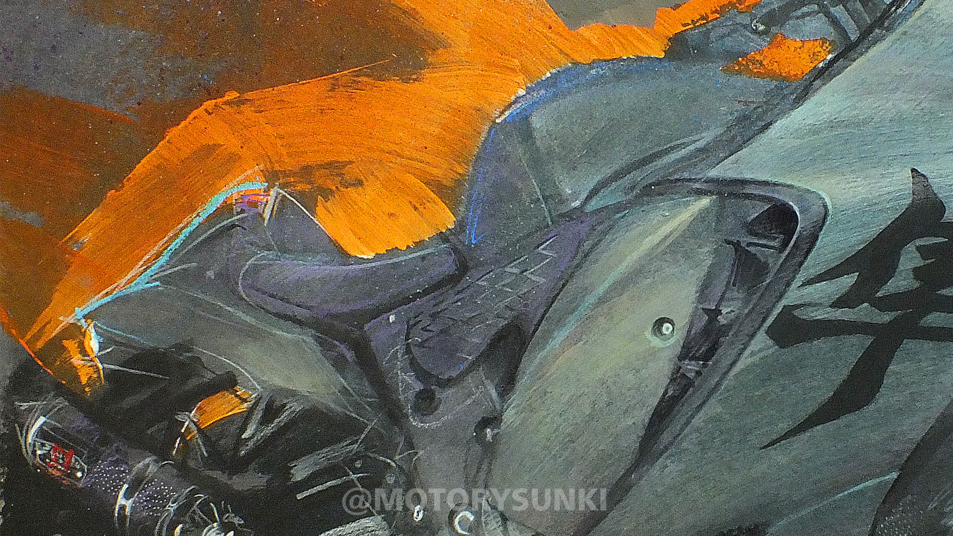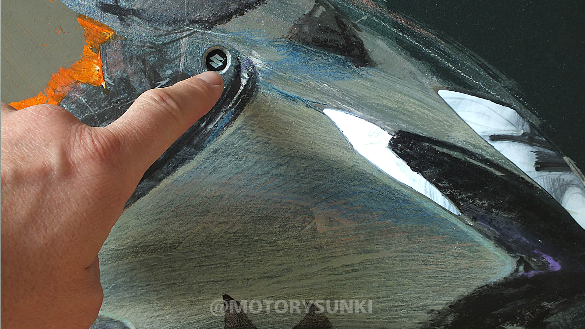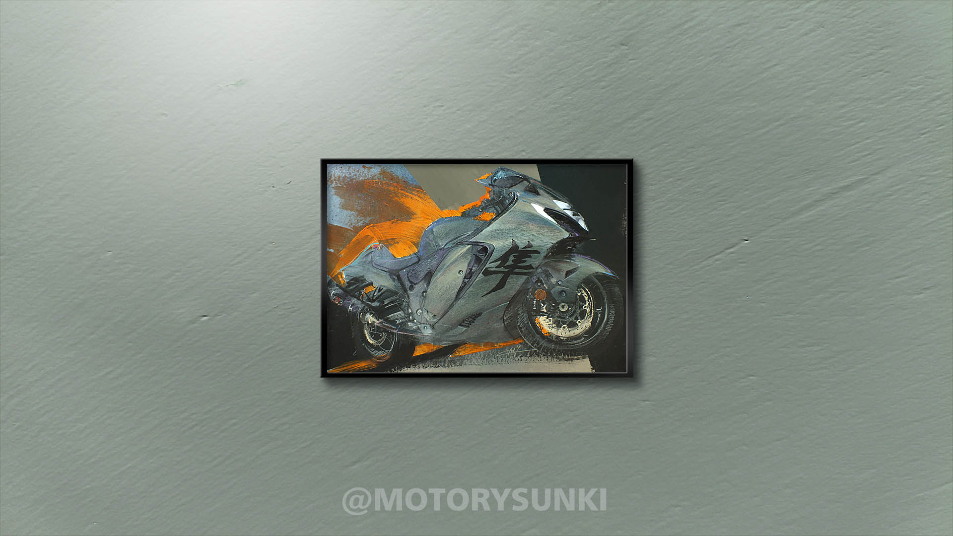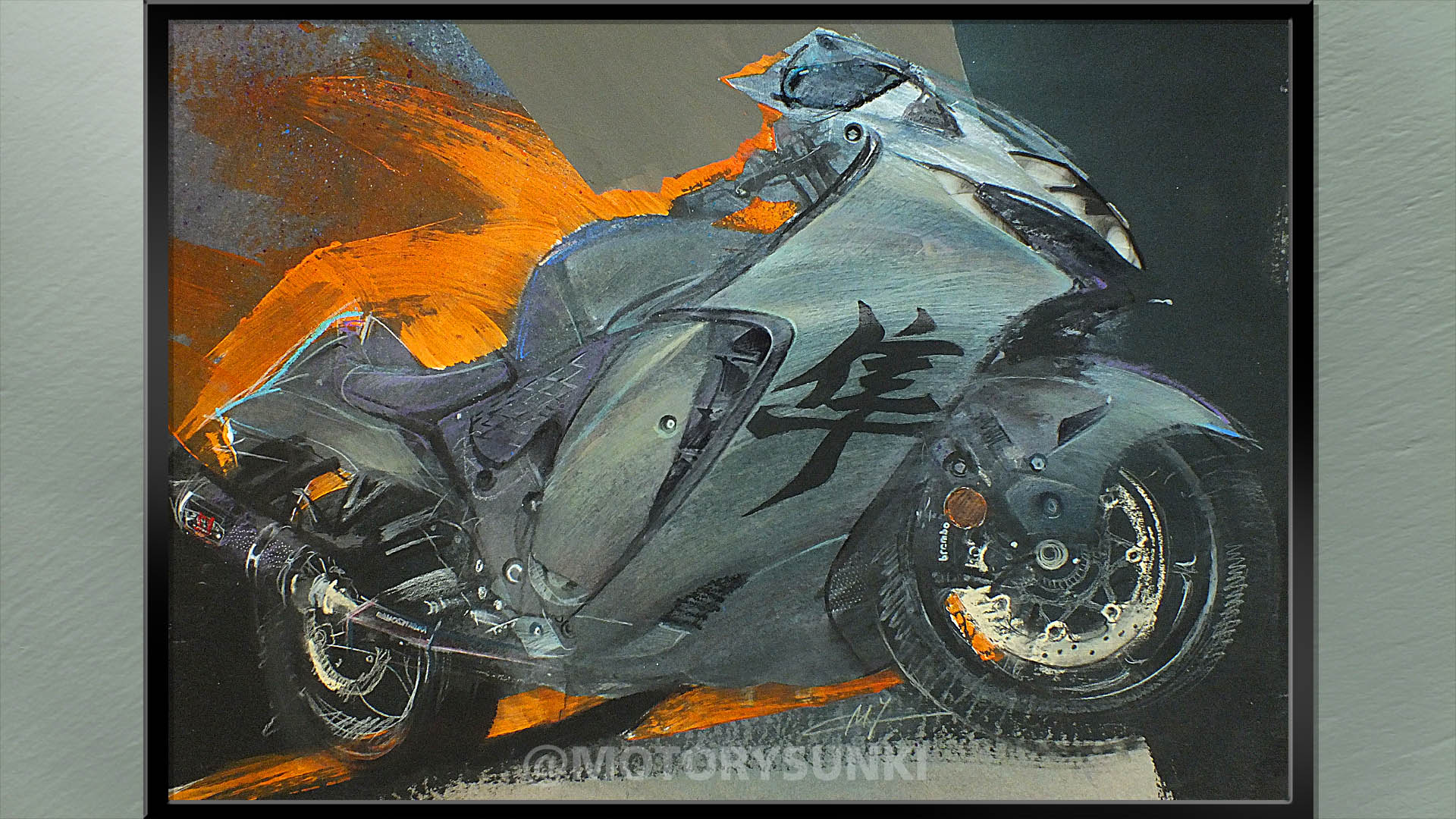 Kolor steel green metallic musi być taki jak trzeba. I do tego te ledowe oczy muszą świecić – tak stwierdziłem po dwóch godzinach wpatrywania się w Hayabusę. Rysunek na zamówienie Marka, 80×60 wykonany akrylami, pastelami, markerami, kredą, węglem, z instalacją led. Wymagający motocykl i wymagające zadanie, ale udało się. Marek, pozdrawiam Cię! Obraz jedzie do Ciebie.