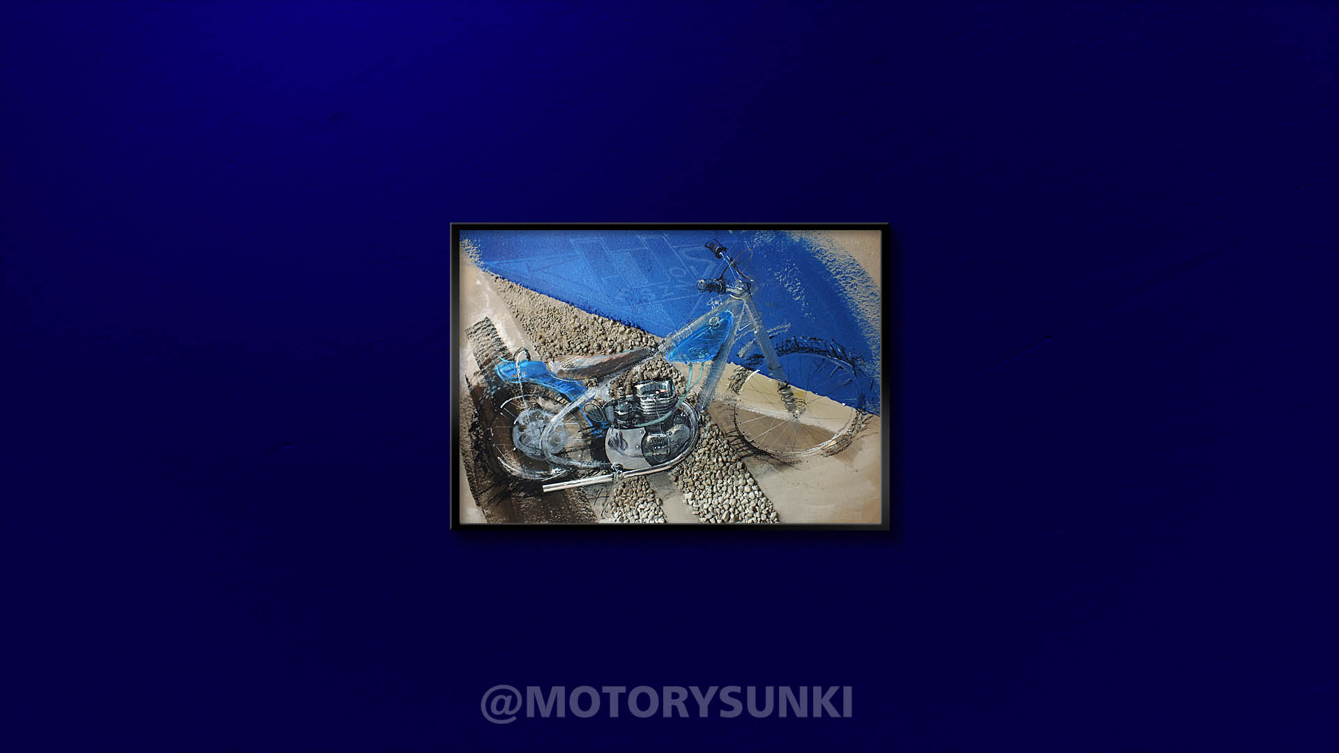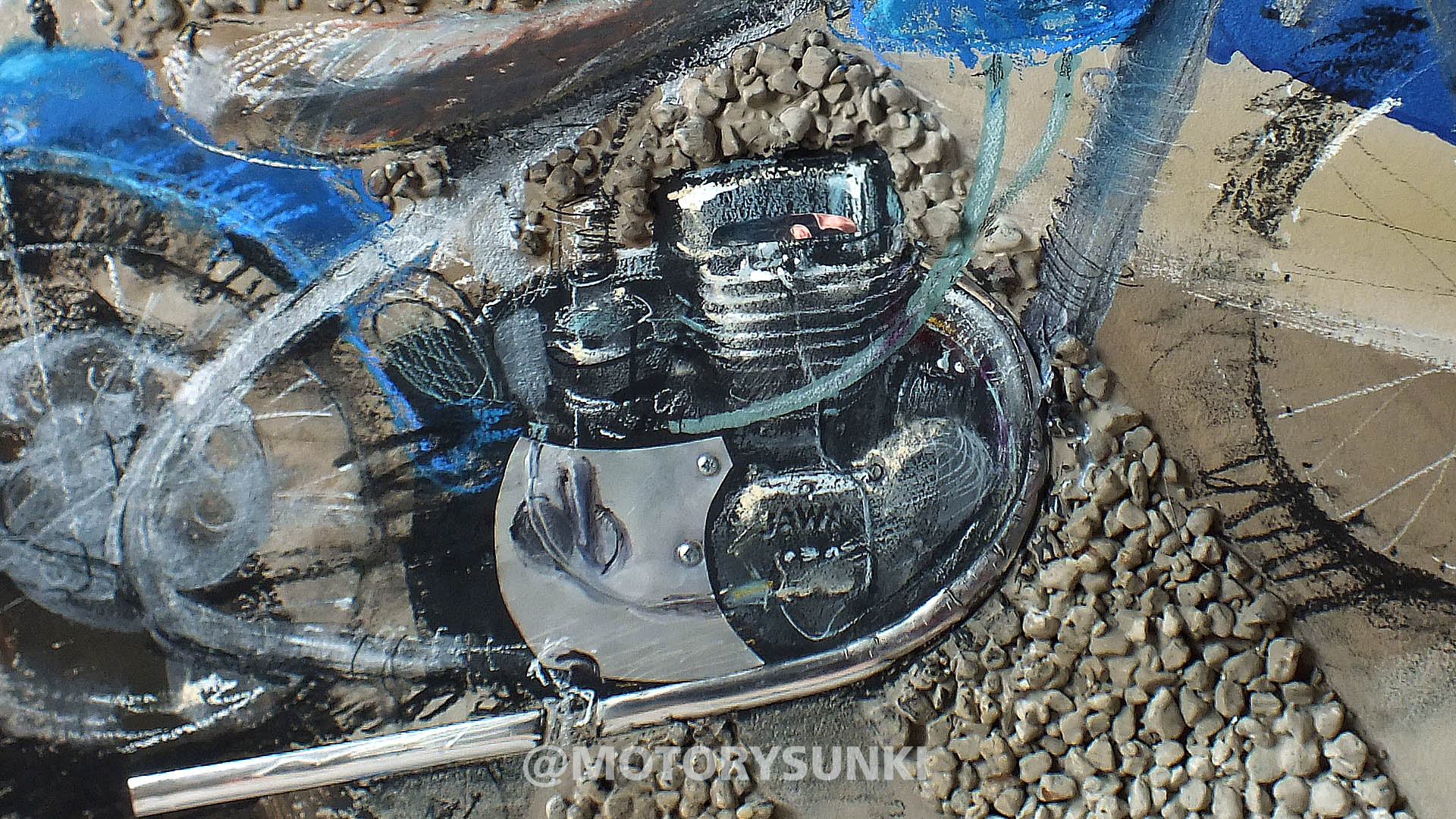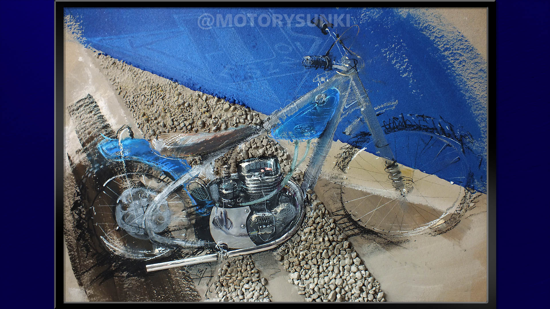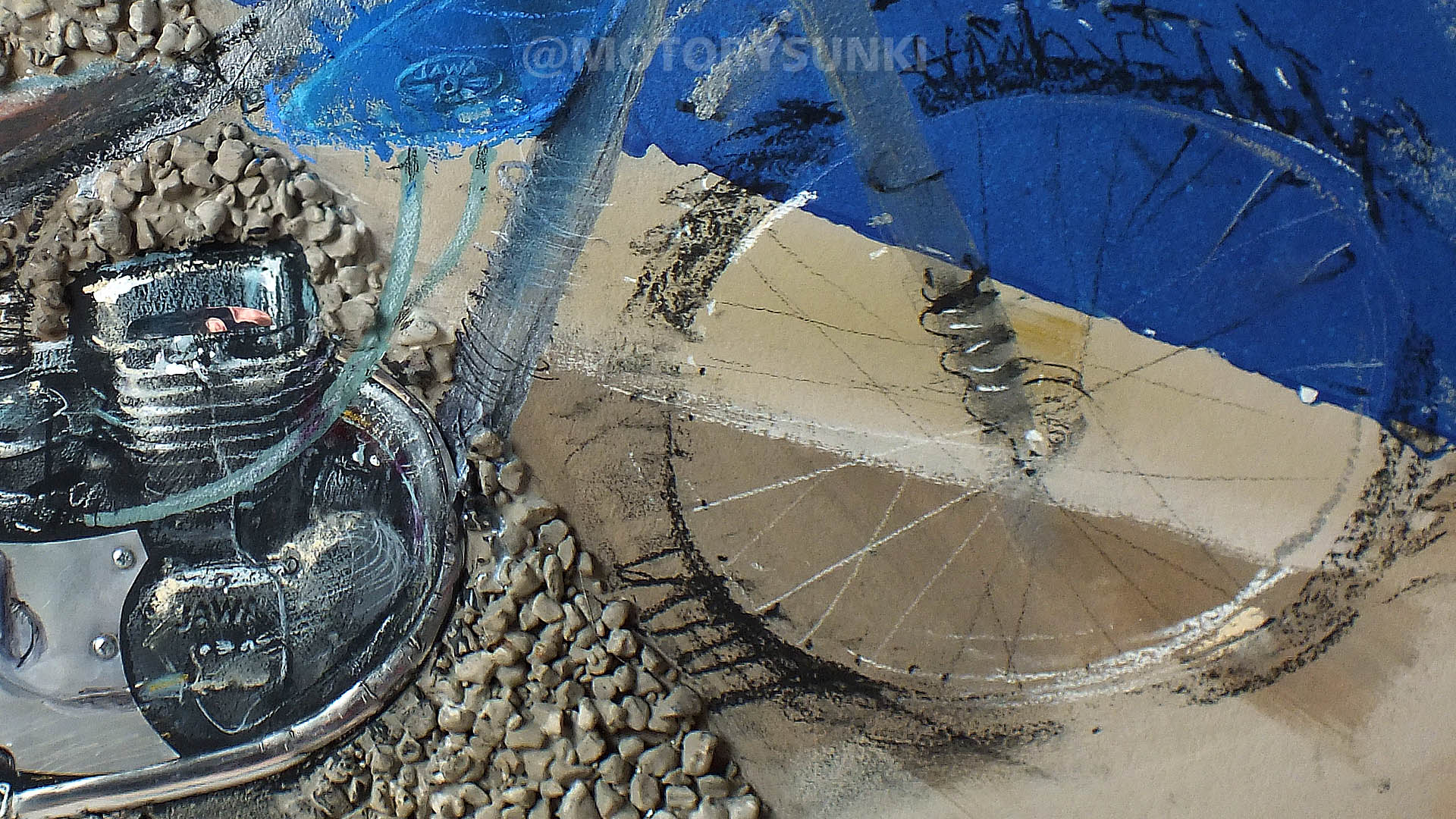 Jawa Dt500 890 Speedway – motocykl, którym zawodnicy Unii Leszno zdobywali mistrzostwa Polski w żużlu! Rysunek w formacie 100 x 70 na zamówienie Pani Anety. W rysunku wykorzystałem tradycyjne narzędzia; pastele, węgiel, ołówek, farby akrylowe, ale również blachę aluminiową, chromowaną listwę i najważniejsze – żwirek, który dokładnie wypłukałem i przykleiłem na żywicę epoksydową.
