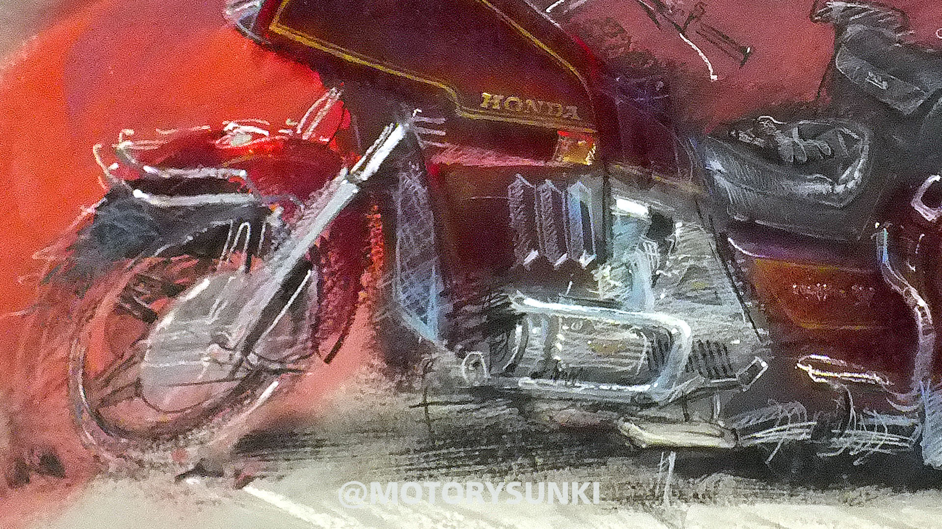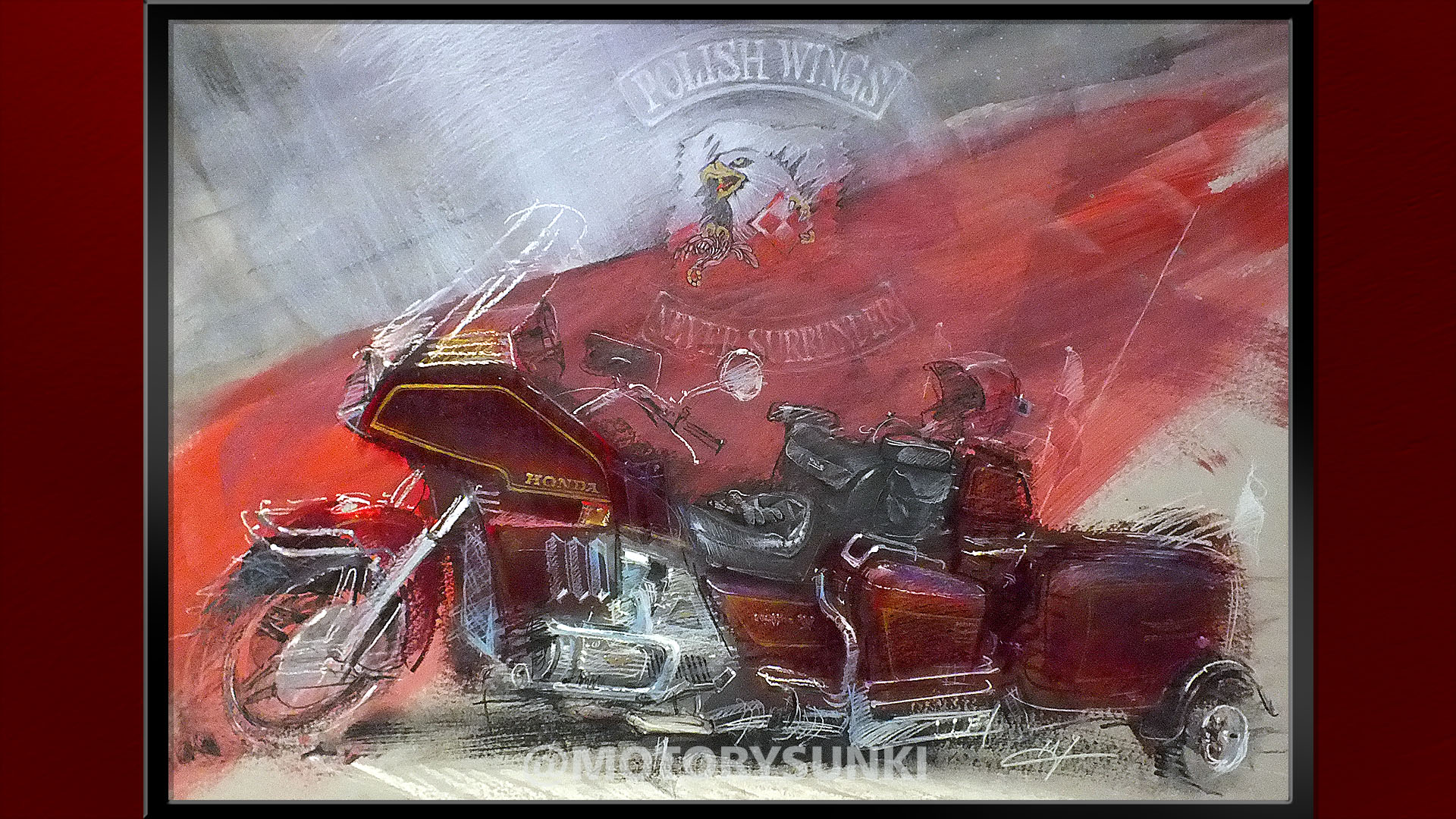 Paweł samotnie podróżuje po Europie motocyklem – oto jeden z jego ulubionych zaprzęgów – Honda Goldwing 1100 z przyczepą. W rysunku skupiłem się na dwóch ważnych rzeczach i te narysowałem bardzo dokładnie: ekwipunek Pawła, jego torby na tylnym siedzeniu, rękawice i kask z kamerą oraz druga rzecz to szparunki na lakierze, które namalowałem złotym akrylem.
